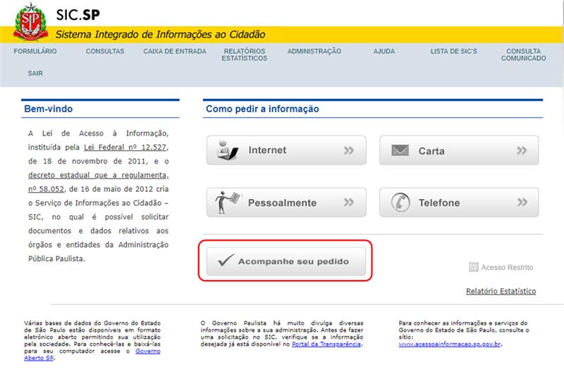 Todos os pedidos de acesso à informação devem ser registrados no Sistema Integrado de Informações ao Cidadão (SIC.SP) que é a porta de entrada única para as solicitações dirigidas ao Poder Executivo Estadual.