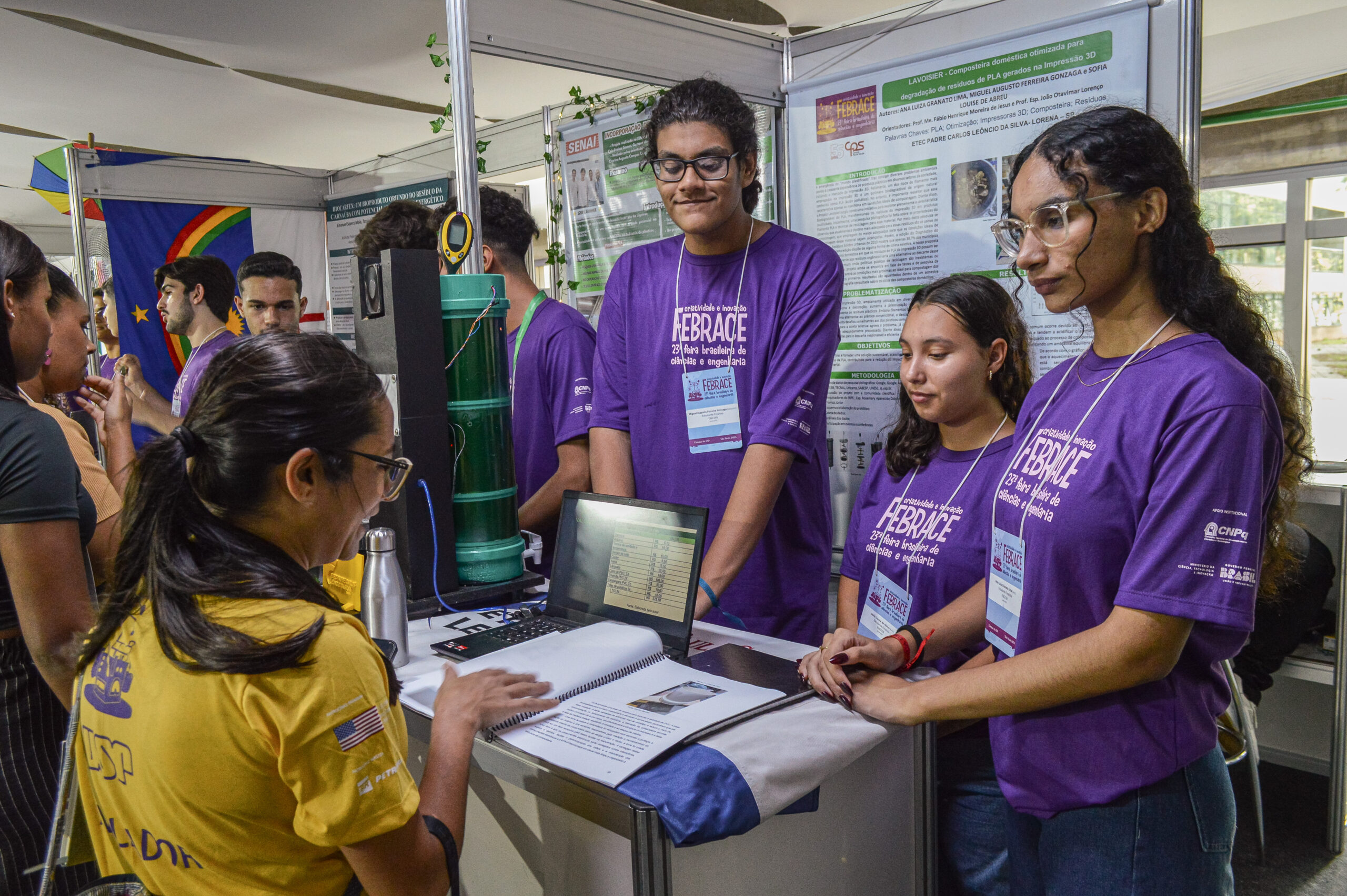 Alunos durante apresentação do trabalho na Febrace 2025, realizada em março, no campus Butantã da USP, na Capital | Foto: Roberto Sungi