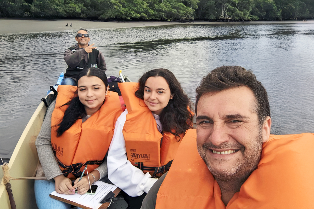 Professor Rodrigo Ferraz em trabalho de campo com as alunas Alice (de branco) e Heloisa, além do barqueiro Nélio | Foto: Divulgação