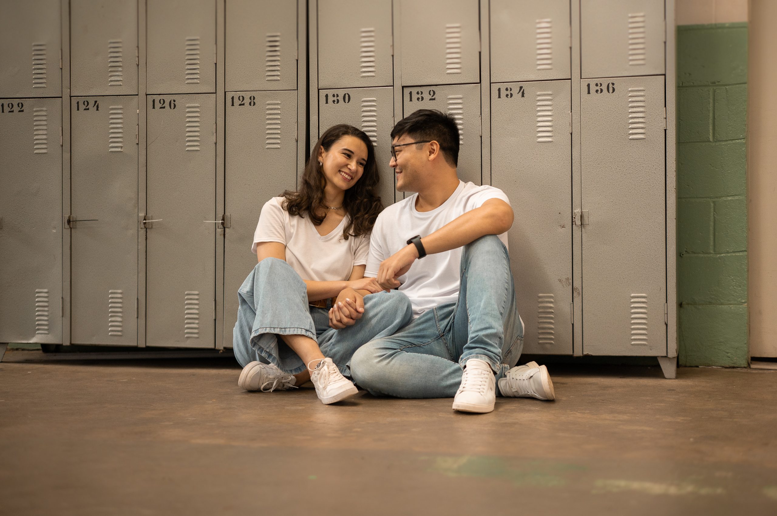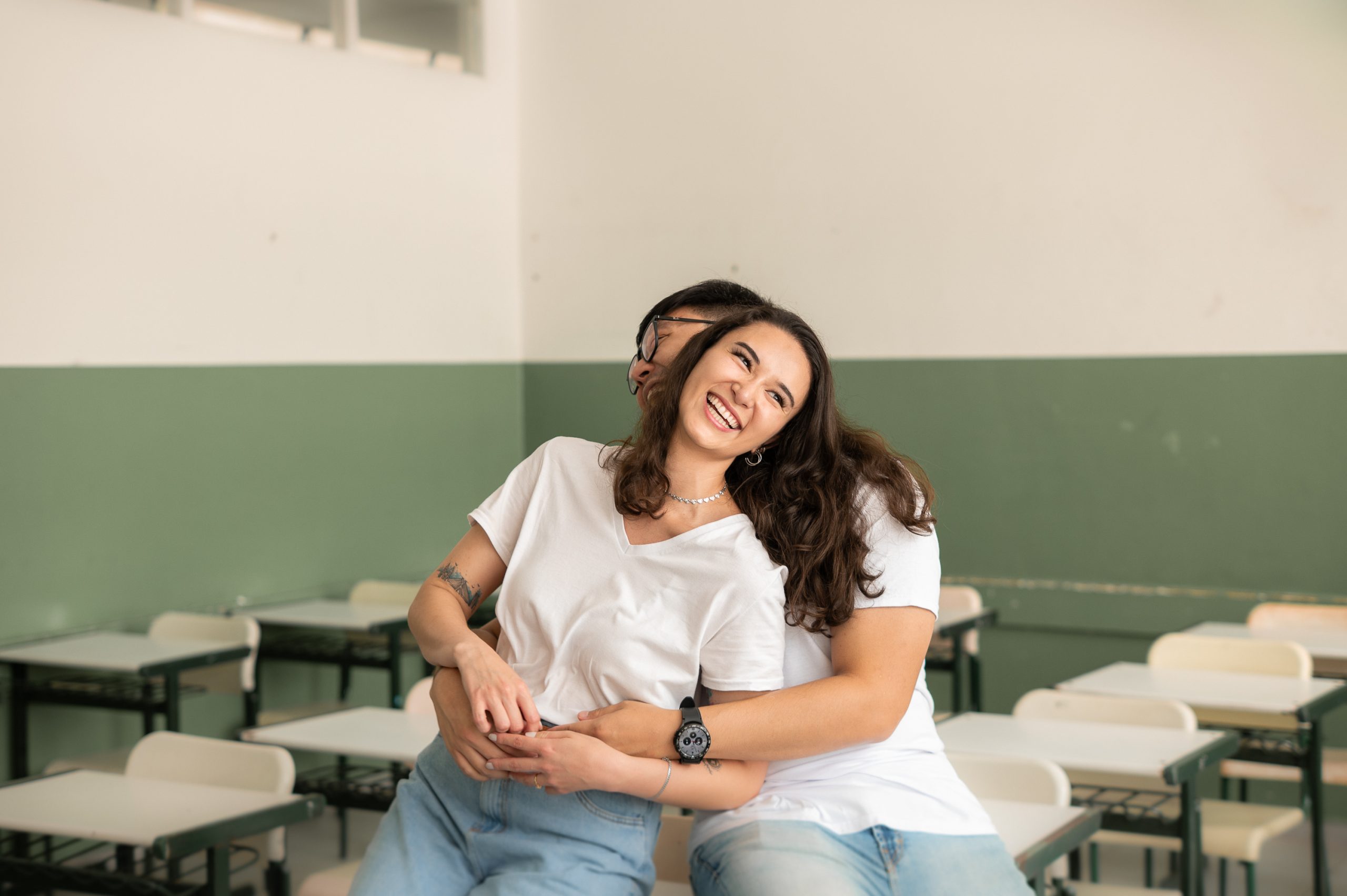 Durante o ensaio, o casal se diverte nas dependências da Etec onde estudaram e se conheceram | Foto: Matheus Avelar