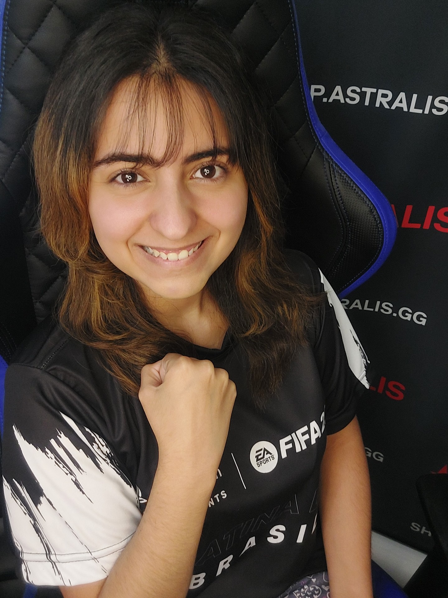 Stephanie Santos, conhecida no cenário gamer como TecaFut66, foi a primeira jogadora profissional de ‘FIFA’ no mundo e integrante da ‘Elite Division’ da modalidade