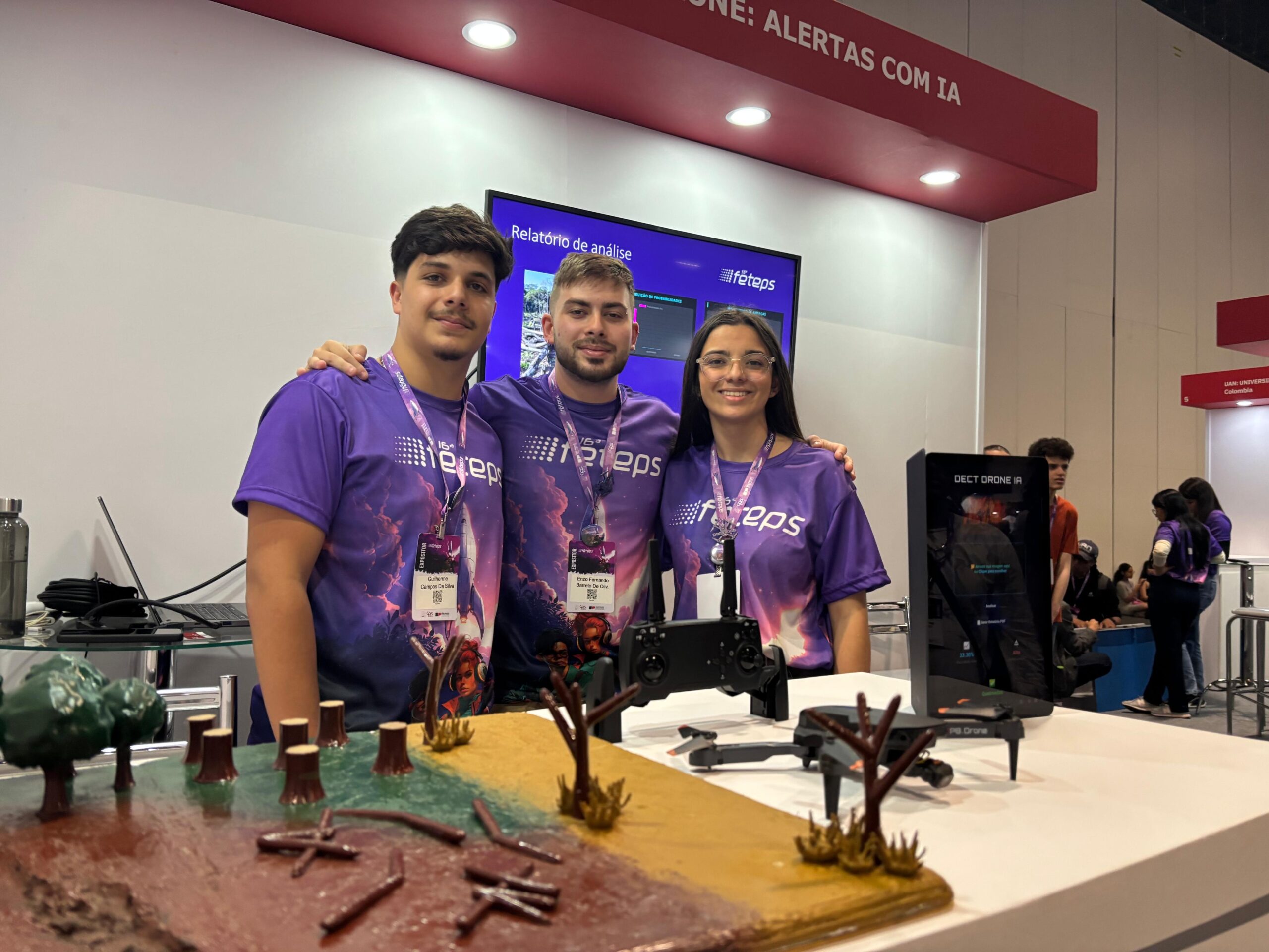 A experiência na última edição da Feteps mostrou-se tão transformadora que fez uma equipe de Avaré retornar para apresentar uma nova criação. Pela segunda vez na feira, Guilherme da Silva, Maria Teixeira e Enzo Fortes, da Faculdade de Engenharia e Administração Paulista, criaram um projeto com foco em segurança e meio ambiente: o Dect Drone.