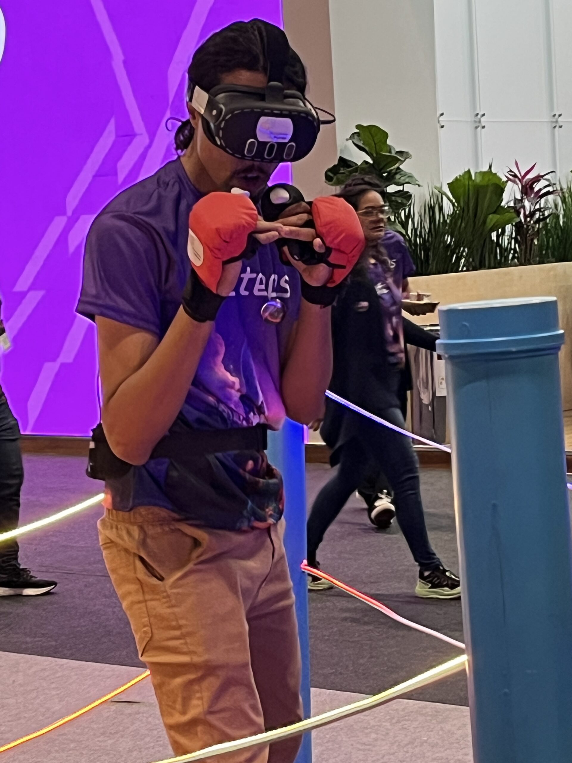 Erick Henrique Martins, do curso de Gestão da Produção Industrial da Fatec Jahu, de Jaú, está ofegante quando tira os óculos de realidade virtual – ativação trazida por um dos apoiadores. Por cerca de um minuto – o tempo inferior ao de um round – ele lutou em um ringue de boxe virtual. Deixou por algum tempo os colegas, que apresentam com ele o projeto Futebol de botão inclusivo, para circular pela feira. “Estou gostando muito”, conta. “Já conversei com vários expositores, incluindo os estrangeiros”. Passado algum tempo, já refeito da luta, Erick voltou para que os colegas circulassem, descobrindo projetos, fazendo amigos e ampliando os horizontes.