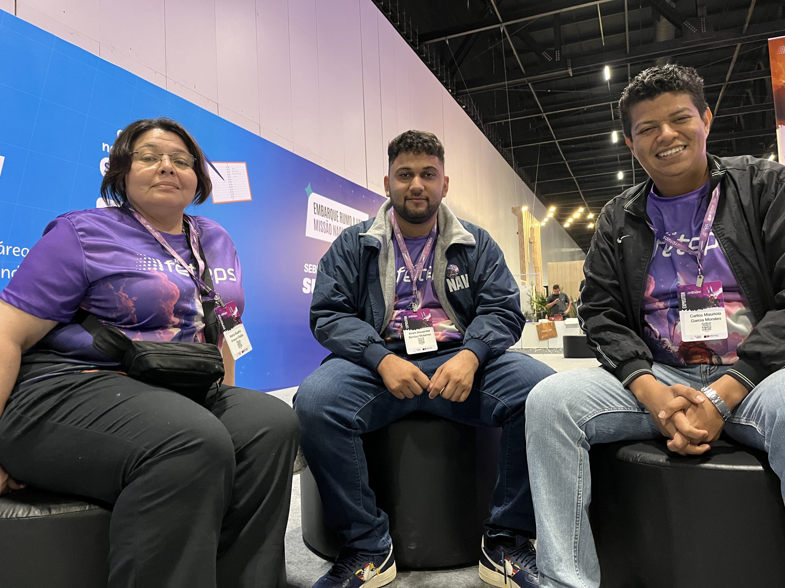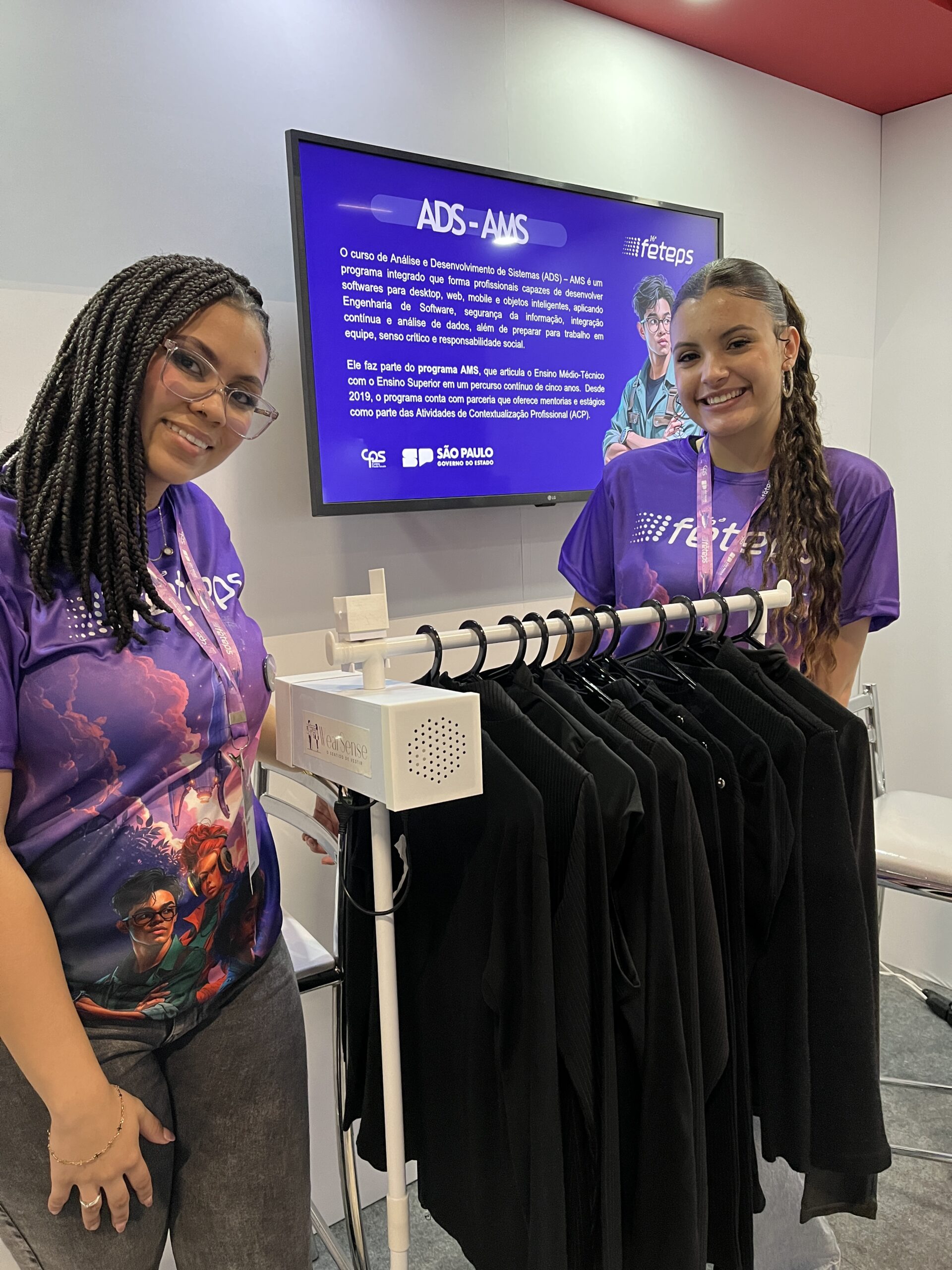 Bianca Farias da Silva e Giovanna da Silva cursam Análise e Desenvolvimento de Sistemas na Faculdade de Tecnologia do Estado (Fatec) Zona Leste. Trouxeram o projeto WearSense, o sentido de vestir, que auxilia deficientes visuais a escolher adequadamente suas roupas e se revezam com a terceira autora do projeto, Ana de Oliveira, nas expedições de reconhecimento pelos estandes. “Está todo mundo animado”, avisa Bianca, aumentando o volume da voz, então abafada pelo entusiasmo da turma da robótica, em plena competição.