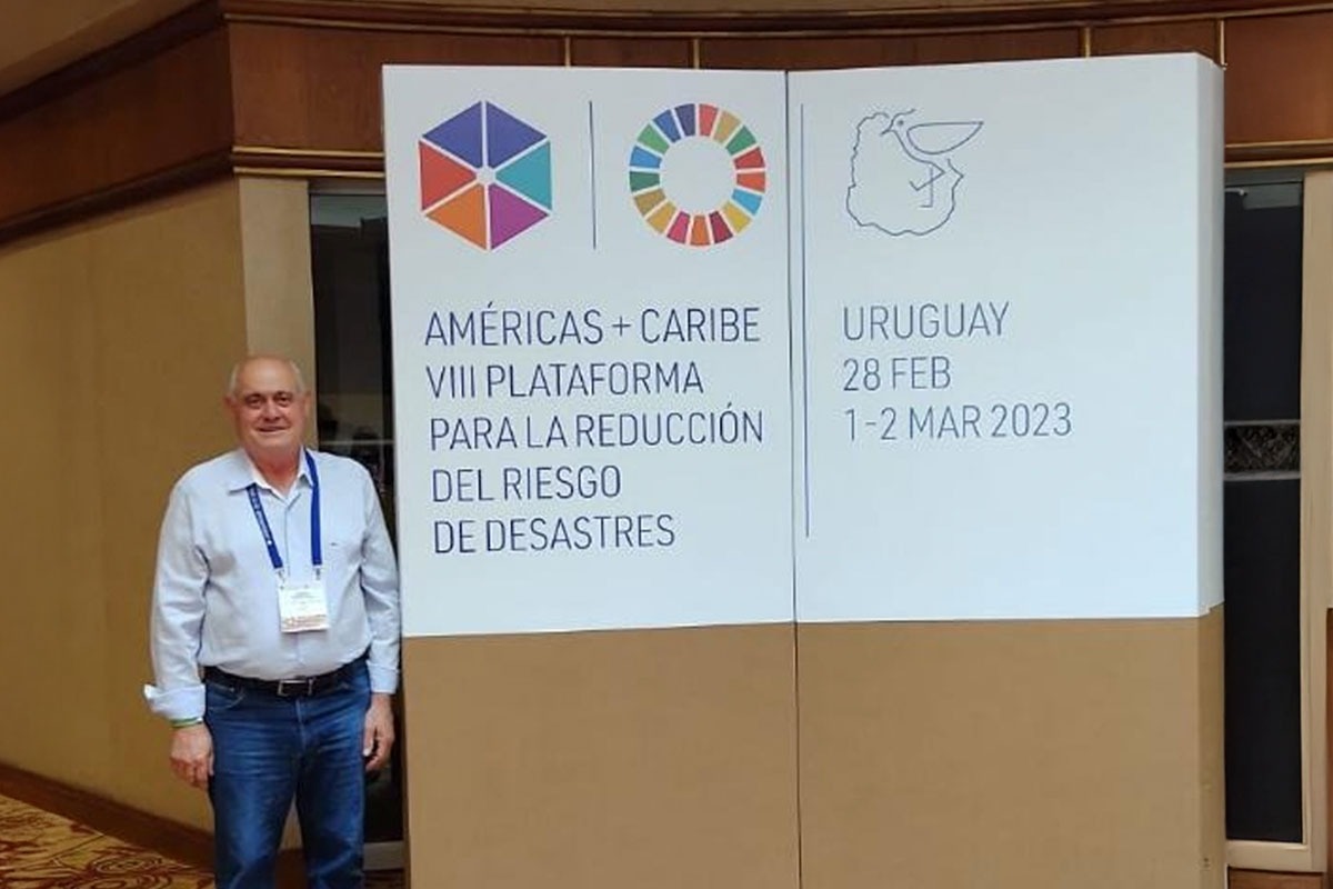 Lourenço Magnoni Jr. durante evento internacional voltado à redução do risco de desastres, realizado no Uruguai, em 2023 l Foto: Divulgação